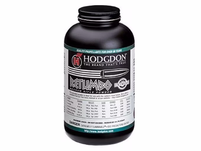 Hodgdon RETUMBO is a magnum powder was designed expressly for the really large overbored cartridges such as the 7mm Remington Ultra Magnum, 300 Remington Ultra Magnum, 30-378 Weatherby Magnum, etc. RETUMBO adds 40-100 fps more velocity to these cartridges when compared to other normal magnum powders. In addition, it is an Extreme Powder, making it perfect for big game hunting under all types of conditions.